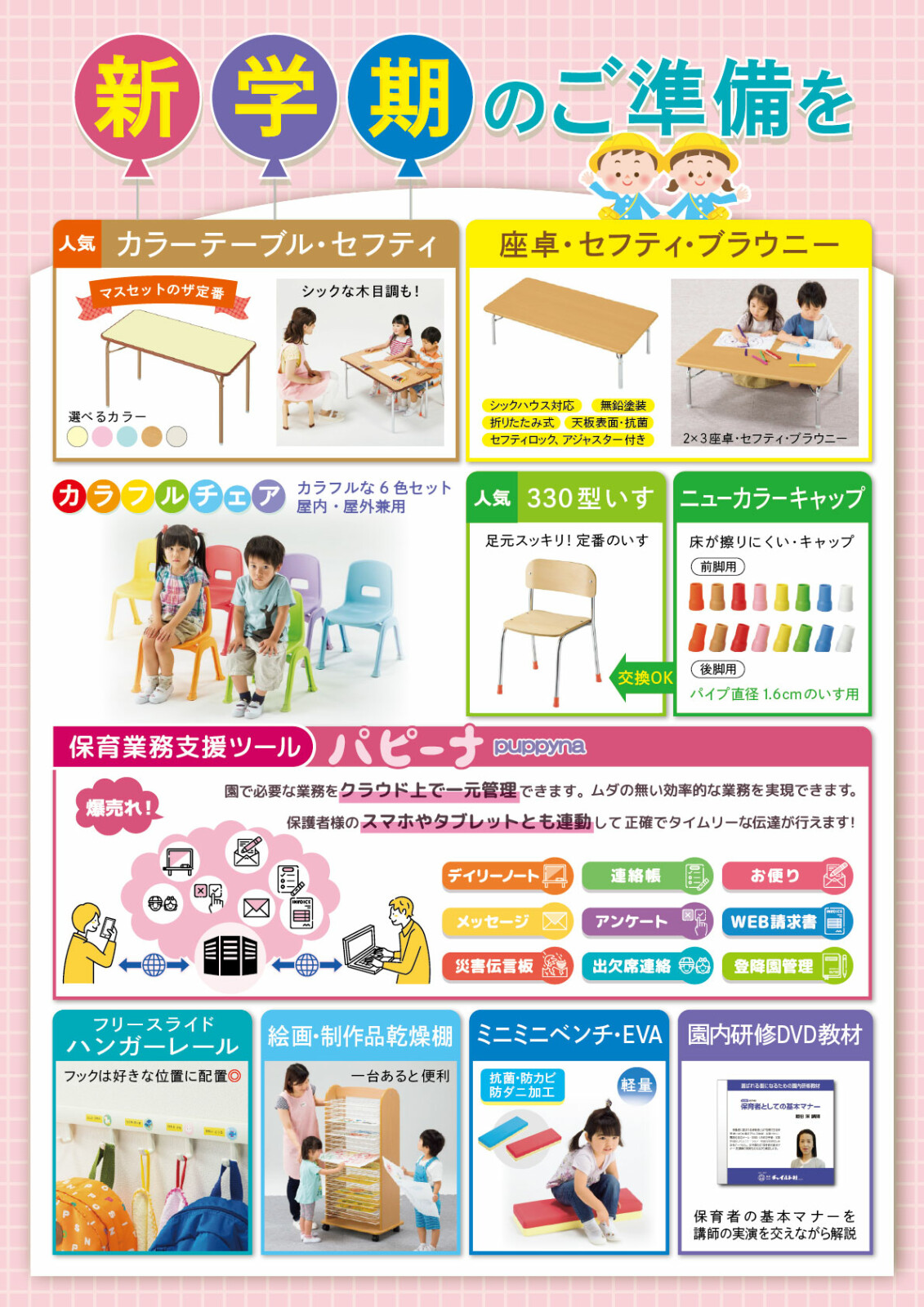 毎日の保育を支える机やいすの追加・買い換え、さらに保育業務支援ツール「パピーナ」など、