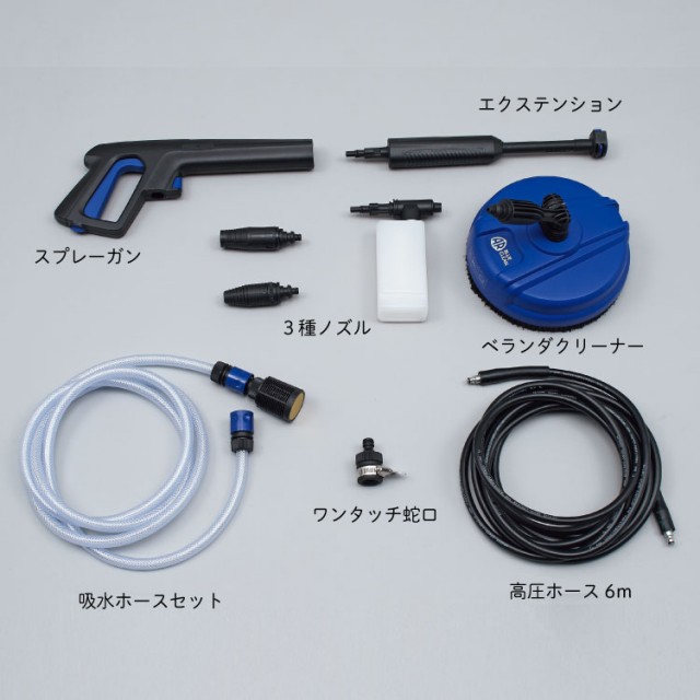 ■付属品:スプレーガン、エクステンション、3種ノズル、ベランダクリーナー、吸水ホースセット、ワンタッチ蛇口、高圧ホース6m付属