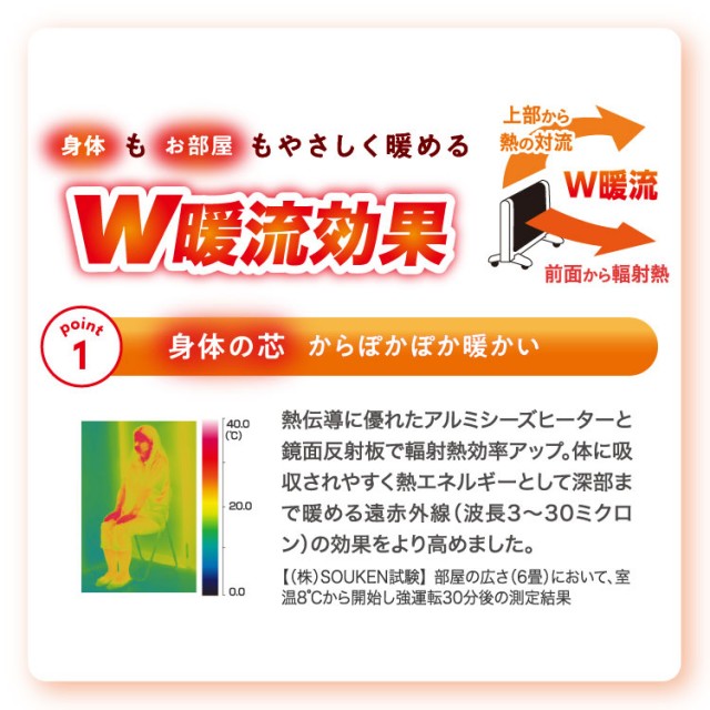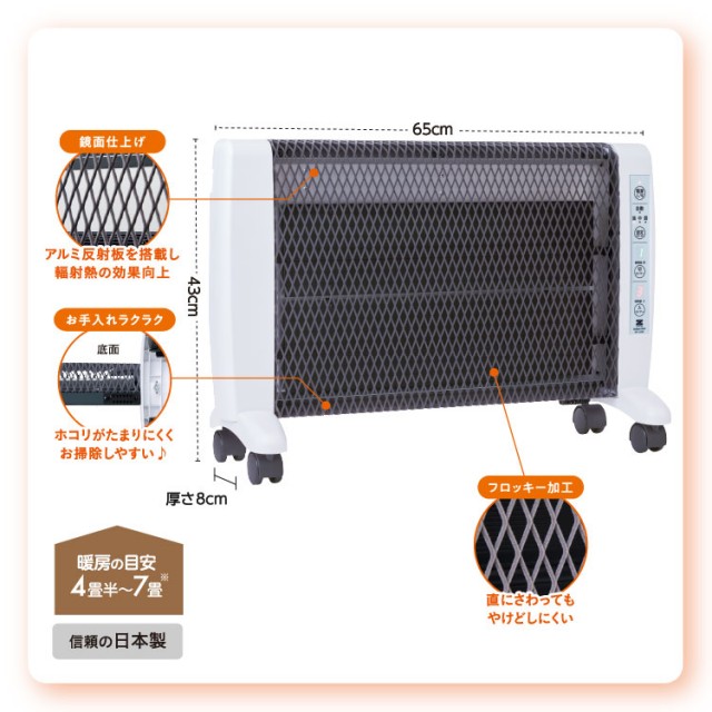- 遠赤外線の輻射熱を効率よく利用しているので、衣類や紙などが触れてもすぐに燃えることはありません。さらにお肌が触れてもヤケドの心配が少なくなるよう<フロッキー加工>を施しています。<転倒時安全装置>を採用しています。