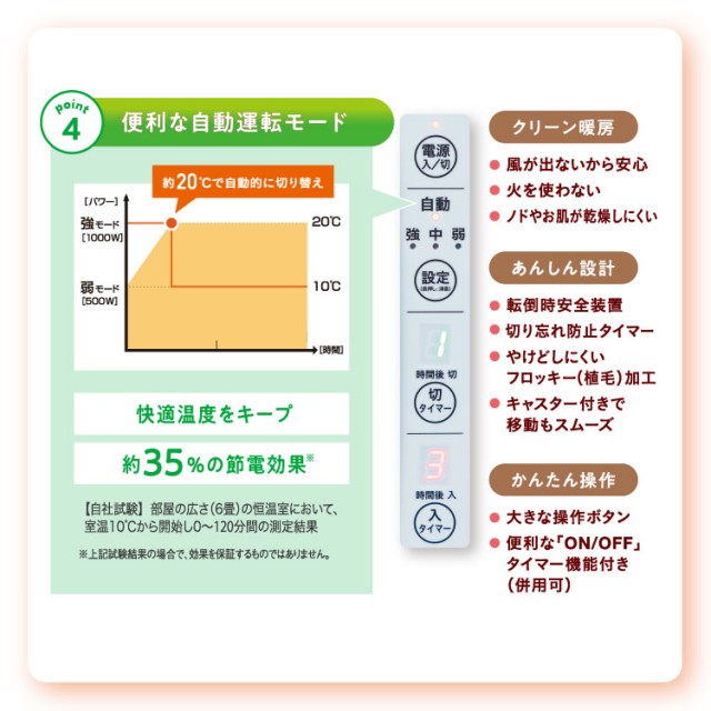 - ■消費電力:[強]1000W [中]750W [弱]500W、[自動]室温センサーによる強・弱モード自動切り替え