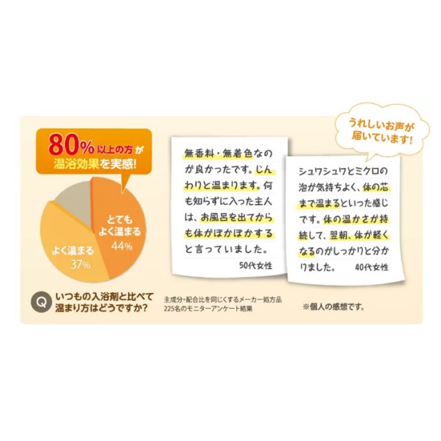 - 無色・無臭の重炭酸イオン入浴剤は、こだわりぬいた“中性発泡”により高濃度に溶け出した「重炭酸イオン」が、発泡後24時間以上も効果が期待できます。