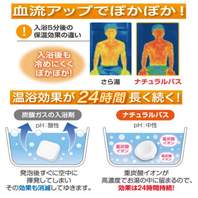- ナチュラルバスは、お湯の中で”重炭酸イオン”を発生させます。重炭酸イオンは、皮膚から体内に吸収されて血流を高めます。基礎代謝が大幅にアップするので免疫力も上がります。基礎体温が1℃上がると免疫力は30%向上すると言われています。