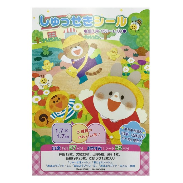 - ・各月7~27種類27日分、欠席・おやすみ・休園・ごほうび・行事シール付き (15シート入り)