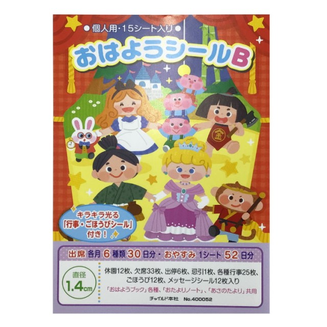 - ・各月6種類30日分、欠席・おやすみ・休園・ごほうび・行事・メッセージシール付き (15シート入り)