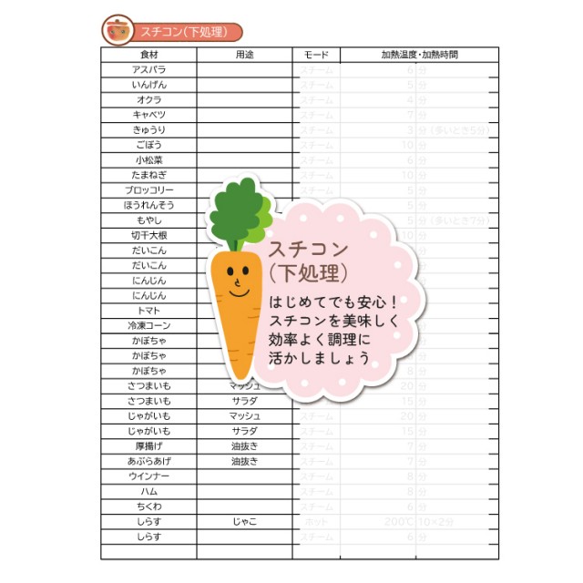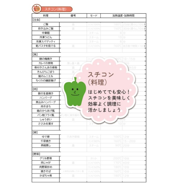 - 下処理用・料理用の設定温度と時間を一覧化。初めてのスチコンでも安心して使えます!