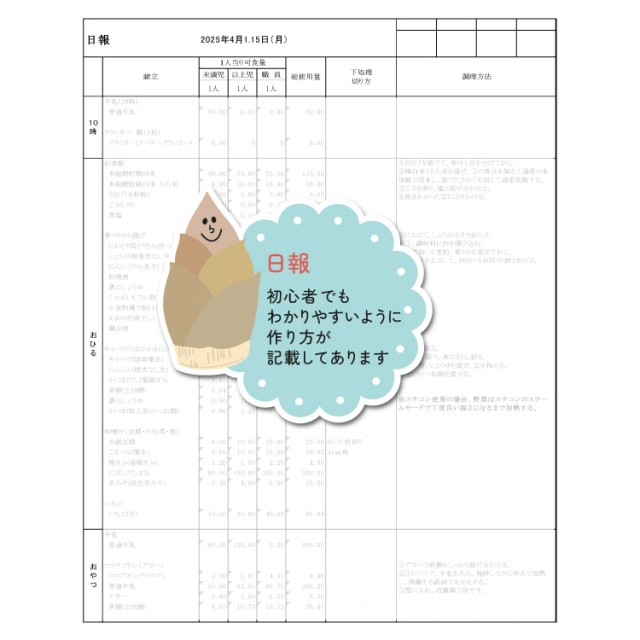 - □主な献立には調理指示付きの日報