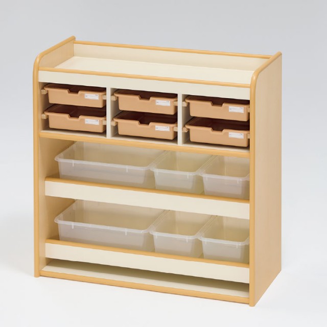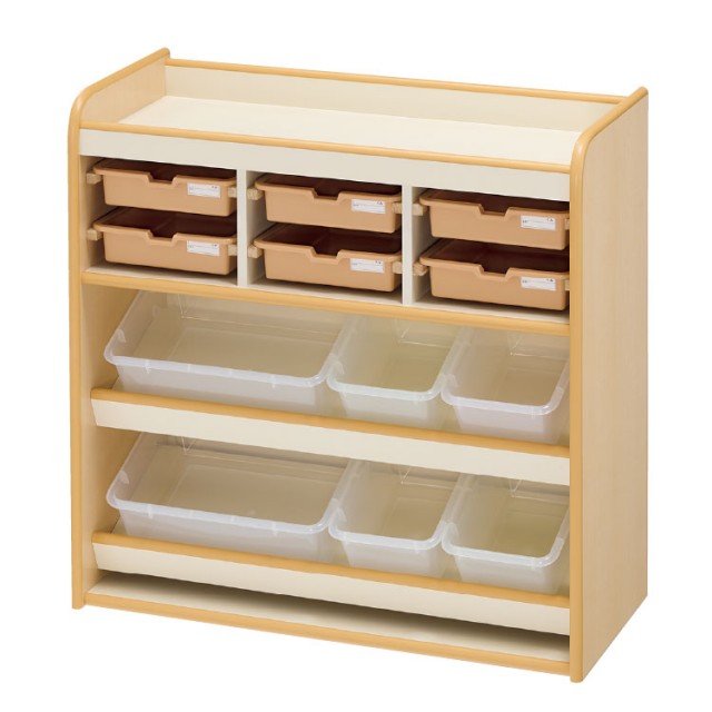 - 傾斜付きの棚板で子どもが見やすく、取り出しやすい