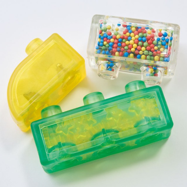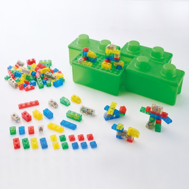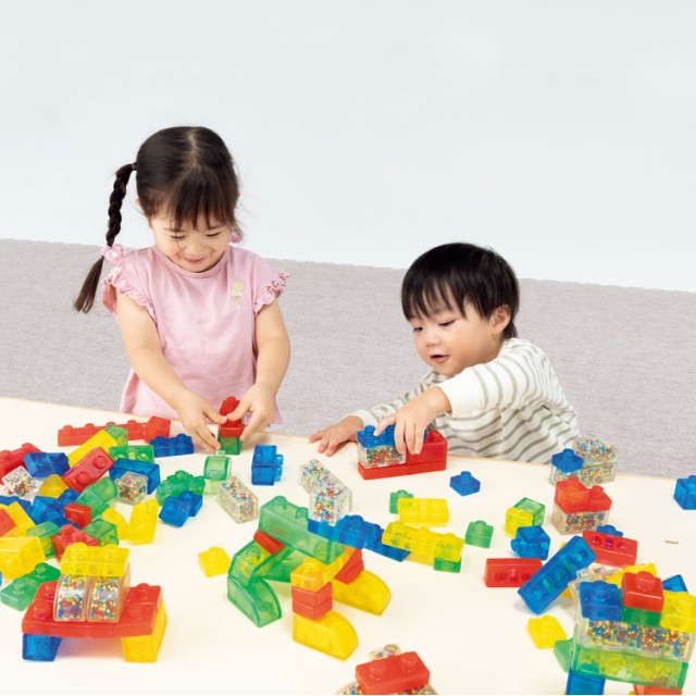 - ブロックの中には砂やビーズ等の異なる素材が入っているので、積み木遊びだけでなく、触感の違いを楽しむ感覚を育めます