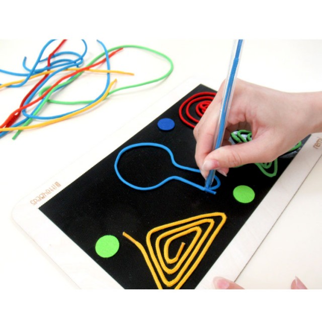 - 面ファスナーのボードにひもがくっ付くので、ペンを使う感覚でお絵かきができます