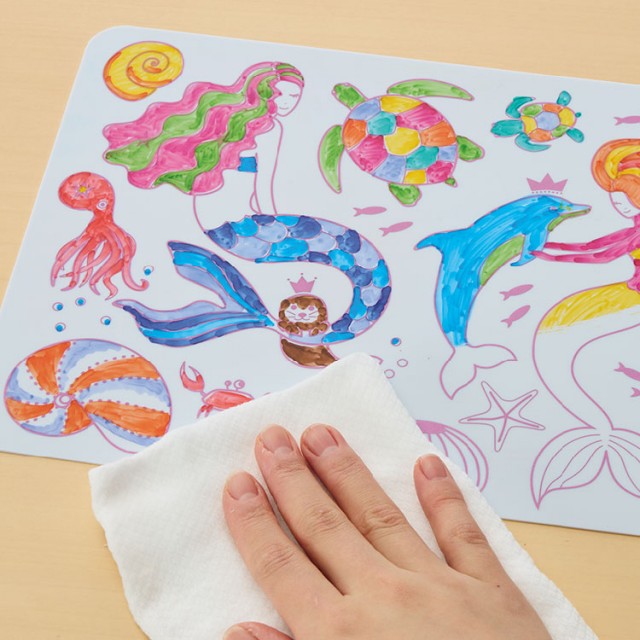 - 付属のペンで描いた後は、濡れたタオルで簡単に拭き取れます(水洗いも可)