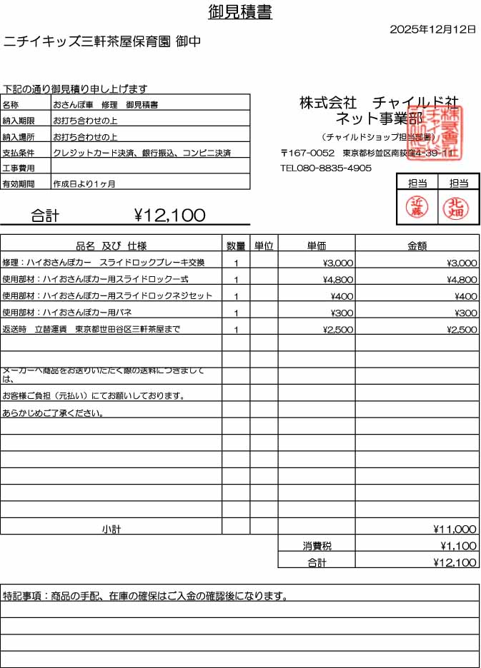 ニチイキッズ三軒茶屋保育園 様 専用 修理お申し込みページ