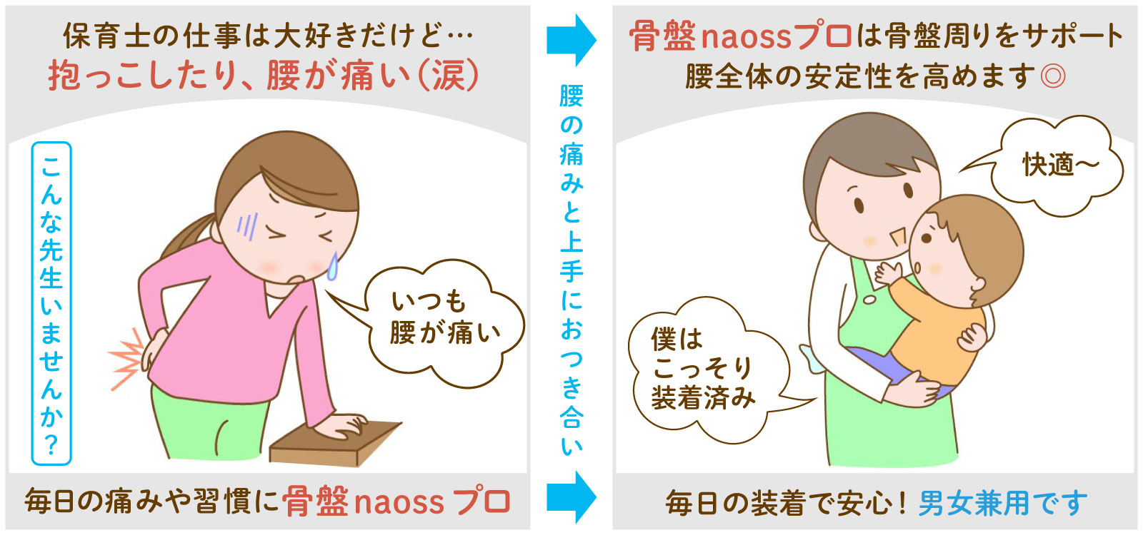 - ・背面には、凹凸のある幅広の「naossパット」を2か所内蔵。ギュッと殿筋部分で締めることで腰の土台となる骨盤の安定性を高めます。