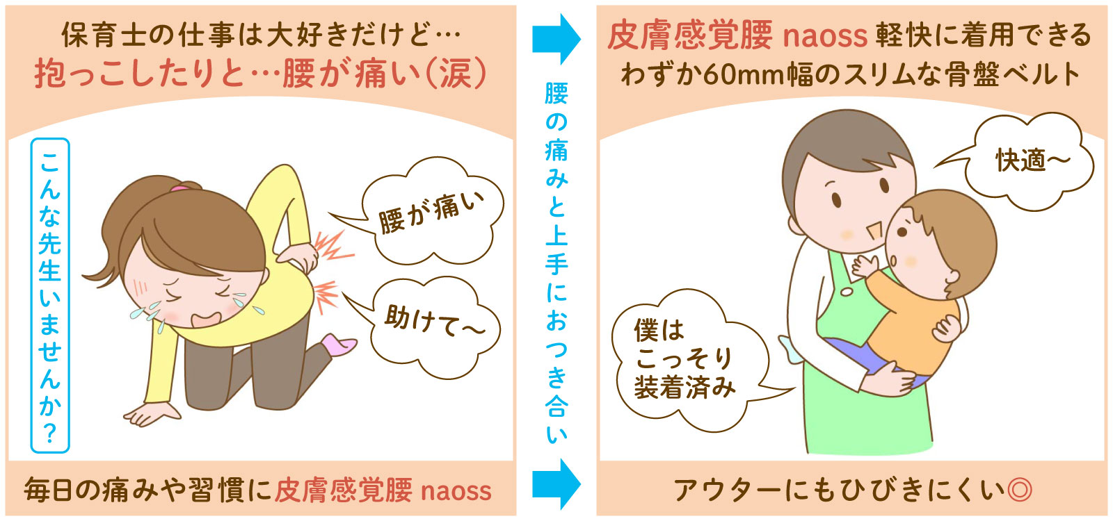 - ・軽快に着用できる、わずか60mm幅のスリムな骨盤ベルト。まるで皮膚と一体化したような着け心地で、アウターにひびきにくい。