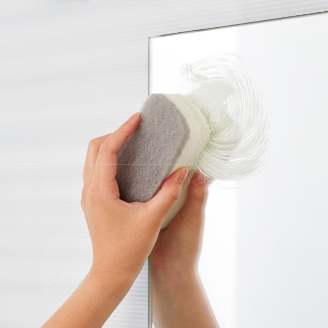 頑固な鏡のウロコ汚れを磨き落とす、鏡の鱗状痕(りんじょうこん)専用の洗浄剤。