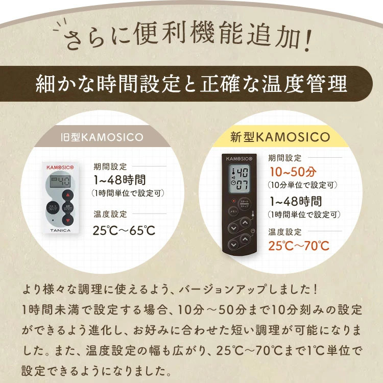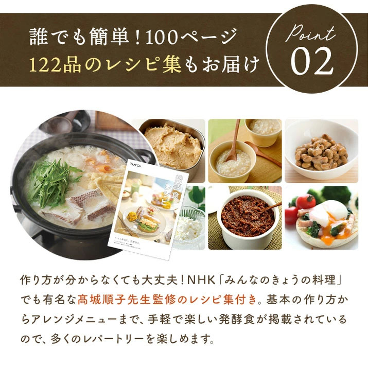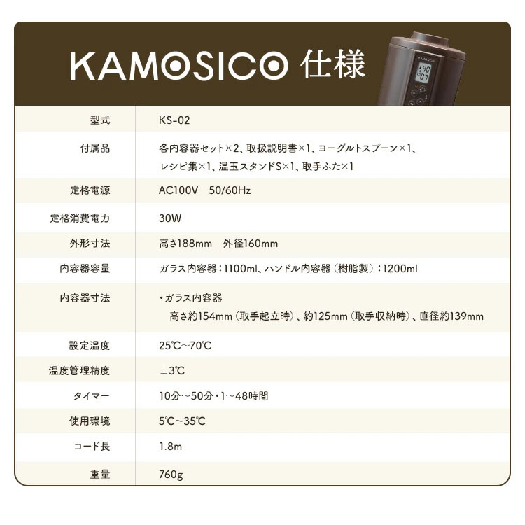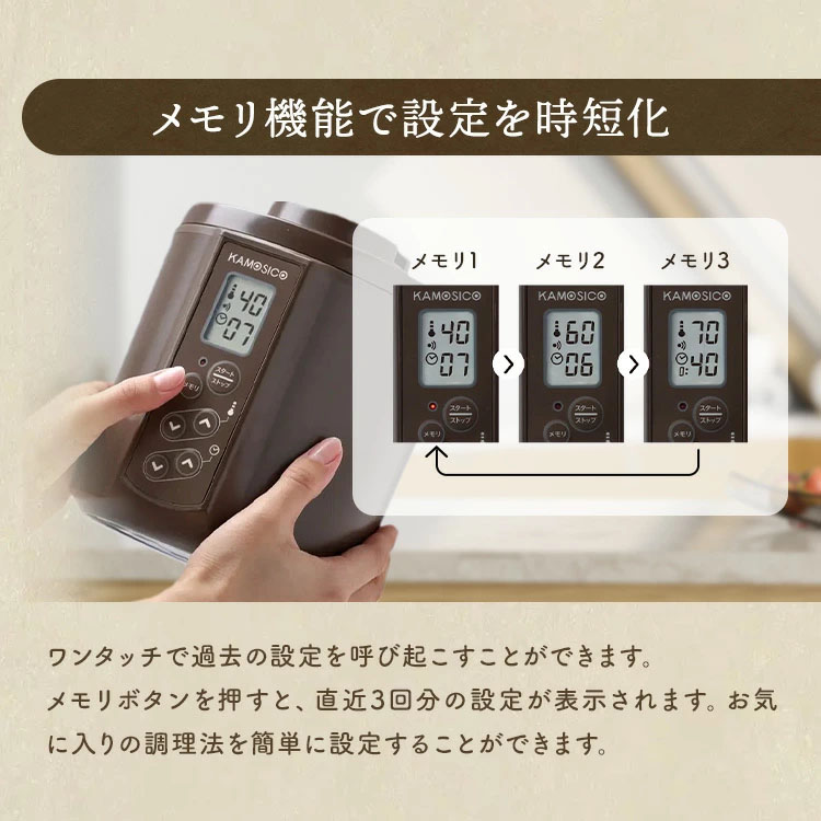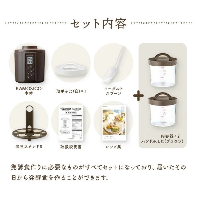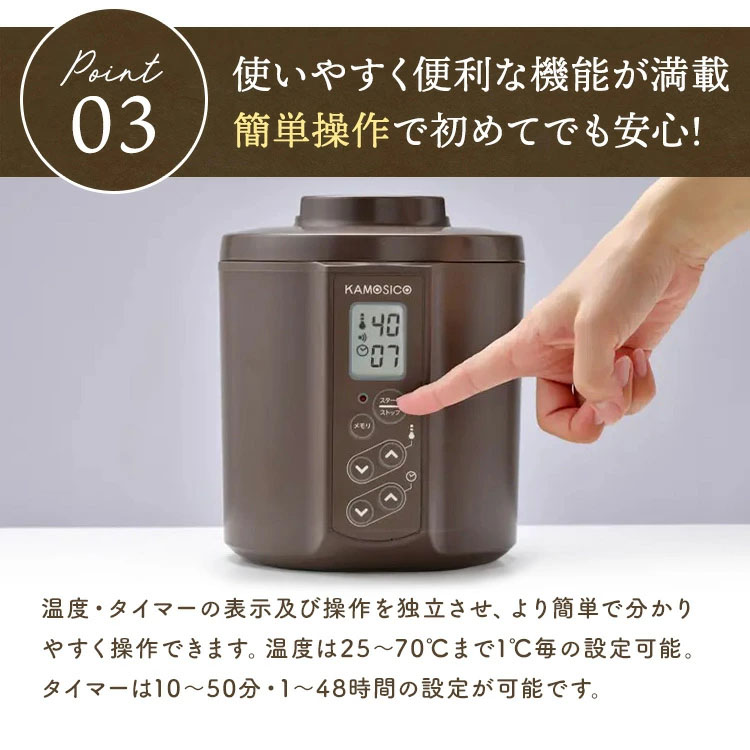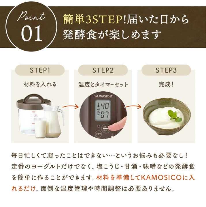 - KAMOSICOを使えば、ヨーグルトや塩こうじ・甘酒・味噌の発酵食を簡単に作ることができます。
