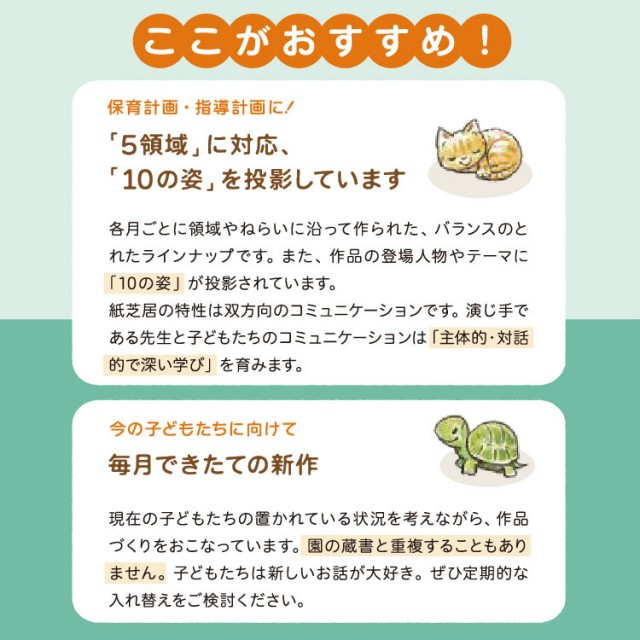 - 5領域に対応し、行事や食育・むかしばなしなど様々なテーマの紙芝居を毎月お届けします。