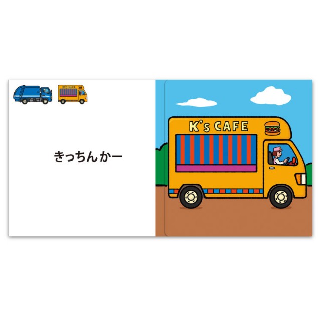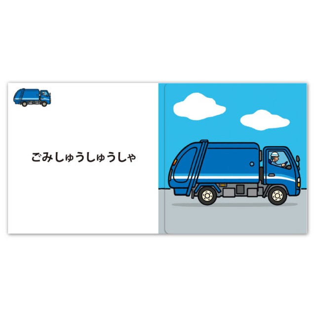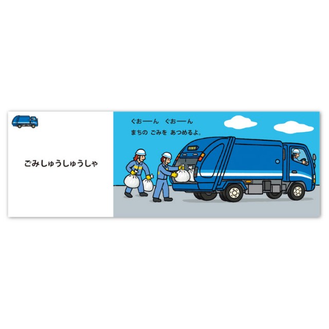- 登場するのは、ゴミ収集車、キッチンカー、フォークリフト、タンクローリー、カーキャリア、ロードローラー、路面電車、高所作業車の「はたらくのりものえほん」計8車。
