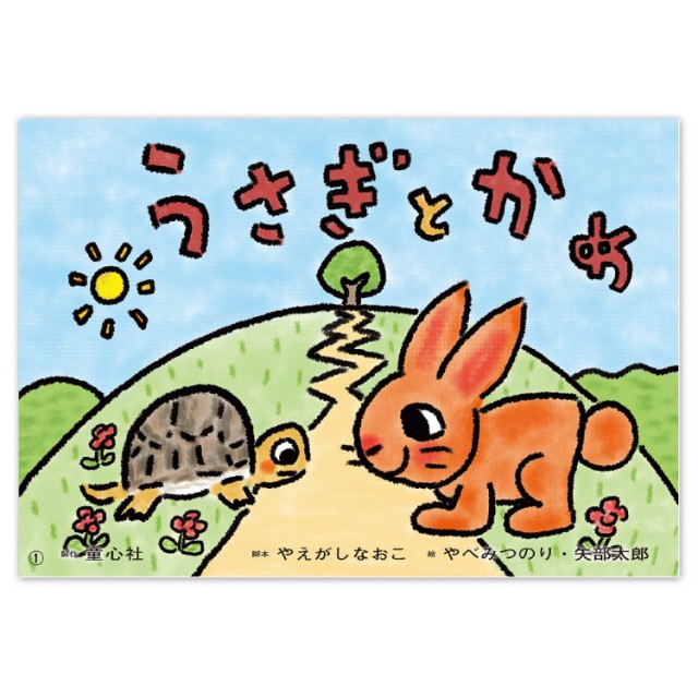 - ある日、うさぎとかめがあいました。「のろのろかめくん、あんまりのろくて、あるいているのか、とまっているのか、わからなかったよ」「うさぎさん、それほどいうなら、ぼくと、きょうそうしないかい?」のはらのなかまもあつまってきました。よーいどん! うさぎとかめの、かけっこがはじまりました。うさぎはあっというまに、とおくへかけていきます。でも、かめはあわてません。「いちに、いちに。ゆっくり、いくぞ」。