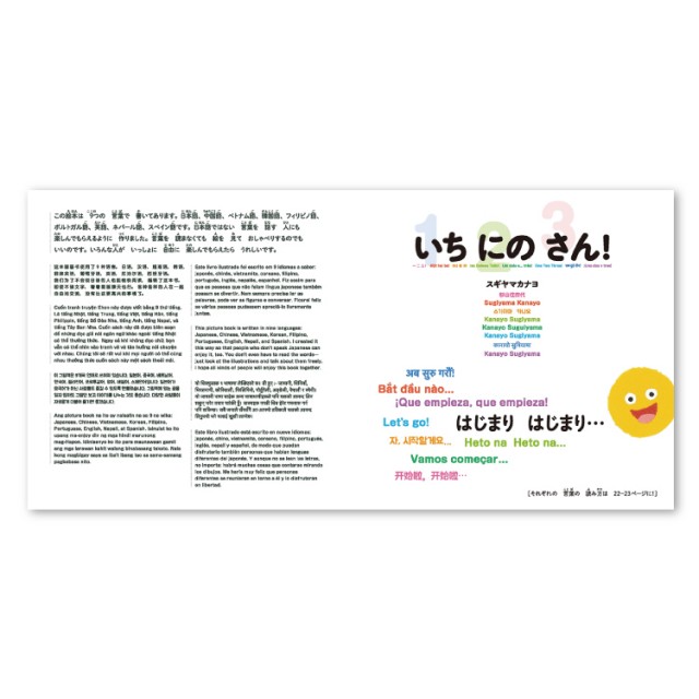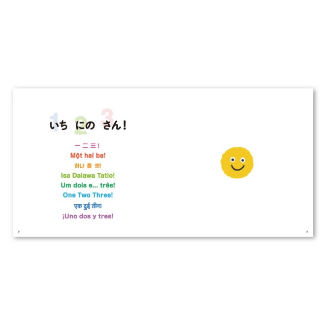 この絵本は、9つの言葉で書いてあります。日本語、中国語、ベトナム語、韓国語、フィリピノ語、ポルトガル語、英語、ネパール語、スペイン語です。日本語ではない言葉を話す人にも楽しんでもらえるように作りました。言葉を読まなくても、絵を見ておしゃべりするのでもいいのです。