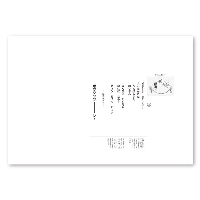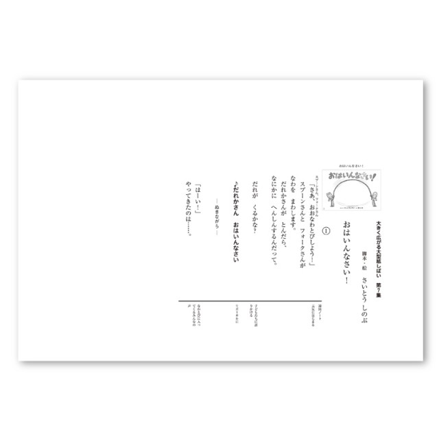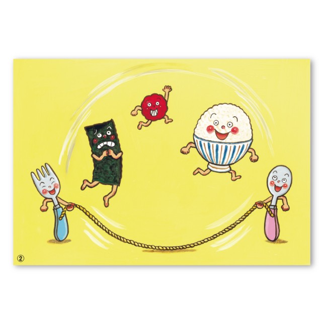 さあ、おおなわとびしよう! スプーンさんとフォークさんがなわをまわします。だれかさんがとんだら、何かにへんしんするんだって。♪だれかさん おはいんなさい……すると、「はーい!」って、ごはんさん、うめぼしさん、のりさんがやってきた。ピョン ピョン ピョンって、みんなでとんだら……おにぎりにへんしん! つぎにやってきたのは、ぎゅうにゅうさん、たまごさん、おさとうさん。今度はなににへんしんするかな?
