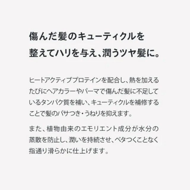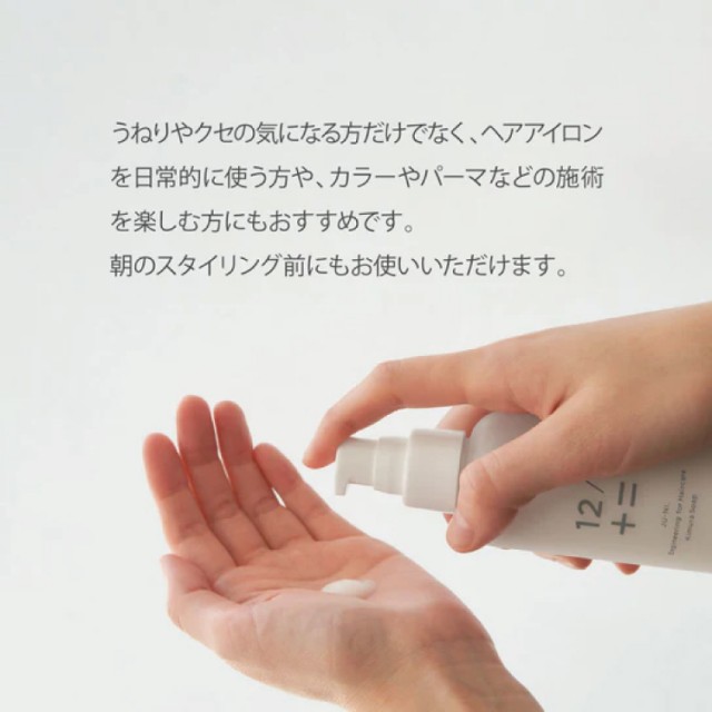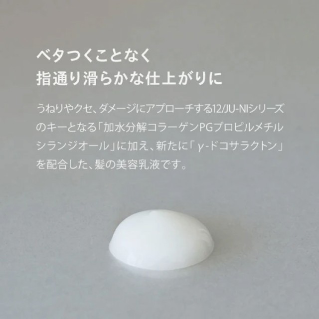 うねりやクセ、ダメージにアプローチする12/JU-NIシリーズのキーとなる「加水分解コラーゲンPGプロピルメチルシランジオール」に加え、新たに「γ-ドコサラクトン」を配合した、髪の美容乳液です。
