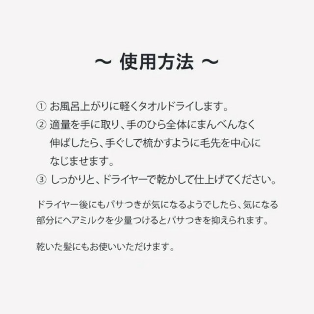 ■商品素材:水、グリセリン、イソペンチルジオール、ジメチコン、トリ(カプリル酸/カプリン酸)グリセリル、水添ナタネ油アルコール、シア脂、ミリスチルアルコール、加水分解コラーゲンPGプロピルメチルシランジオール、γ-ドコサラクトン、イソステアリン酸フィトステリル、ベタイン、PCA-Na、乳酸Na、アルギニン、アスパラギン酸、PCA、グリシン、アラニン、セリン、バリン、プロリン、トレオニン、イソロイシン、ヒスチジン、フェニルアラニン、クオタニウム-91、セテアリルアルコール、セトリモニウムメトサルフェート、ステアリン酸グリセリル(SE)、PPG-3カプリリルエーテル、乳酸、トコフェロール、ステアルトリモニウムクロリド、グアーヒドロキシプロピルトリモニウムクロリド、ジココジモニウムクロリド、アモジメチコン、香料、イソプロパノール、水酸化K、フェノキシエタノール、エチルヘキシルグリセリン