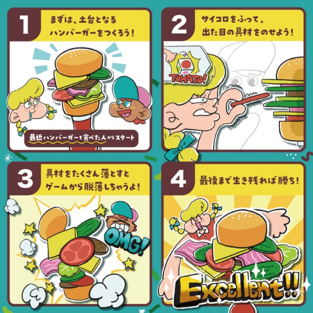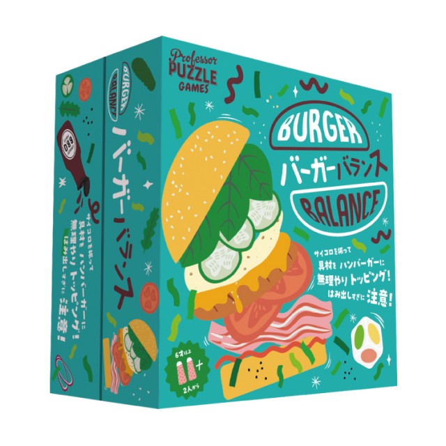 - 「バーガーバランス」はサイコロを振って、ケチャップを倒さないように具材をハンバーガーの横からトッピングするバランスゲームです。