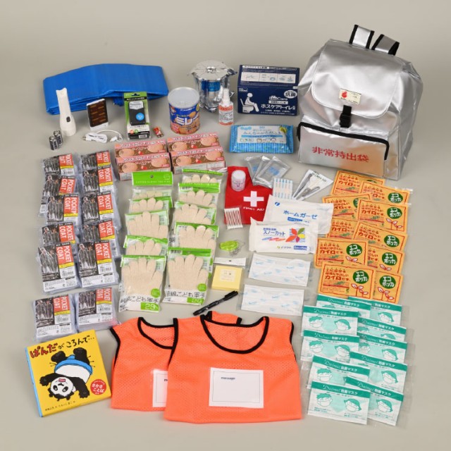 1.大型非常持出袋((公財)日本防炎協会認定品)×1 2.ブルーシート×1 3.救急セット(巾着型)×1 4.ポケットラジオ×1 5.簡易トイレ(20回)×1 6.長期保存ウェットティッシュ30枚入×1 7.子ども用軍手×10 8.子ども用マスク×10 9.大人用マスク×2 10.緊急ホイッスル×1 11.LED懐中電灯×1 12.アルコールスプレー×1 13.カイロ×10 14.ポケットコート大人用×2 15.ポケットコート子ども用×10 16.メッセージベスト×2 17.モバイルバッテリー×1 18.フィットメモ×1 19.油性マーカー黒×1 20.保存用ミレービスケット190g×1 21.ライスクッキー8枚入イチゴ味×4 22.絵本×1 23.単4電池×2 24.10年保存トイレットペーパー200m×1
