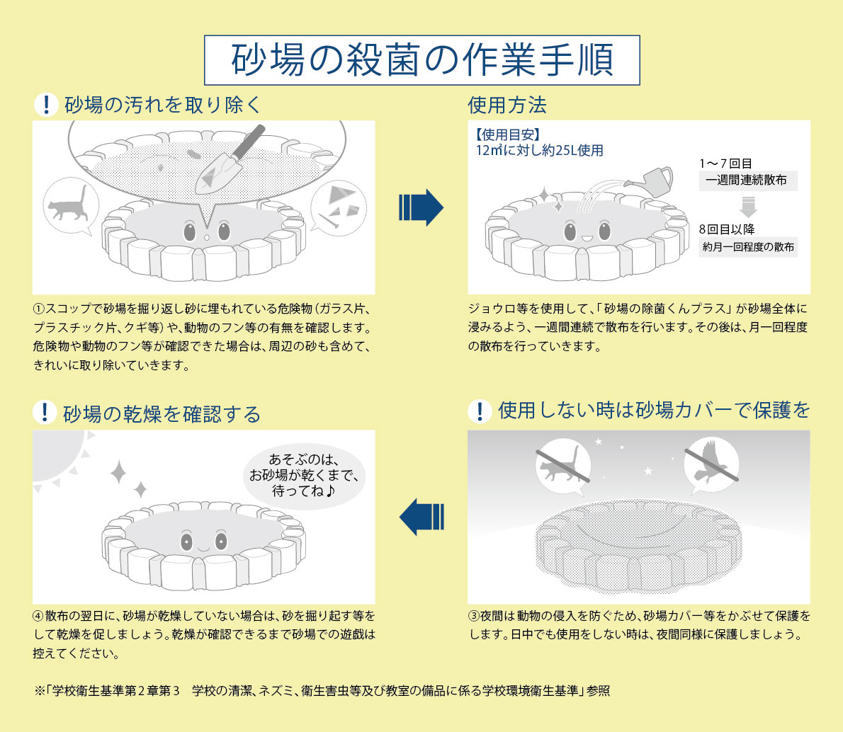 - ① ジョウロ等を使用して砂場全体に浸みるよう、7日間連続で散布を行います。